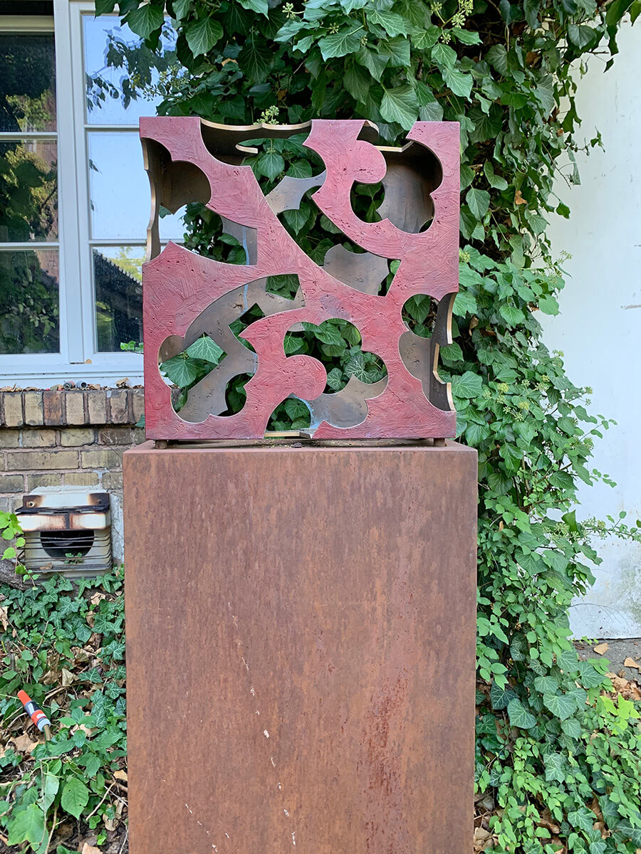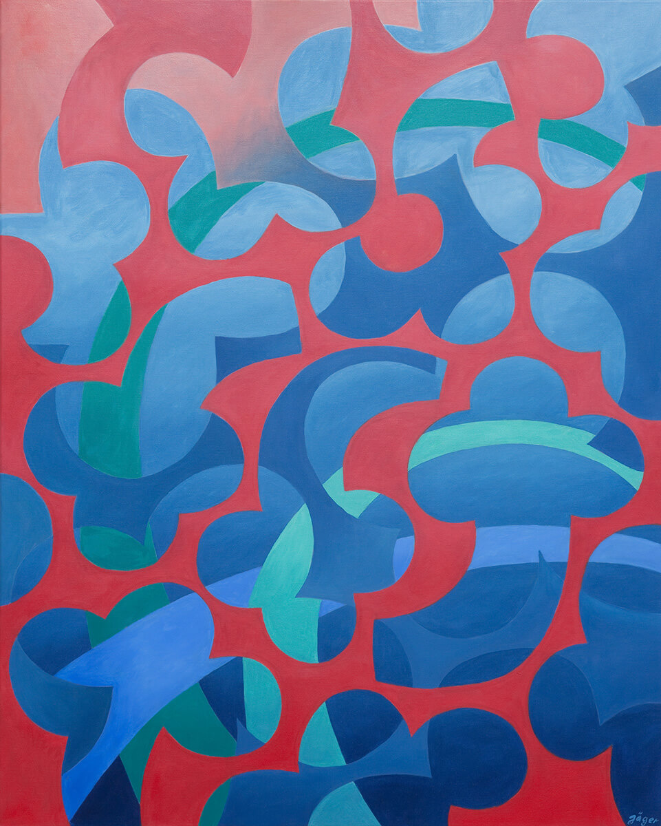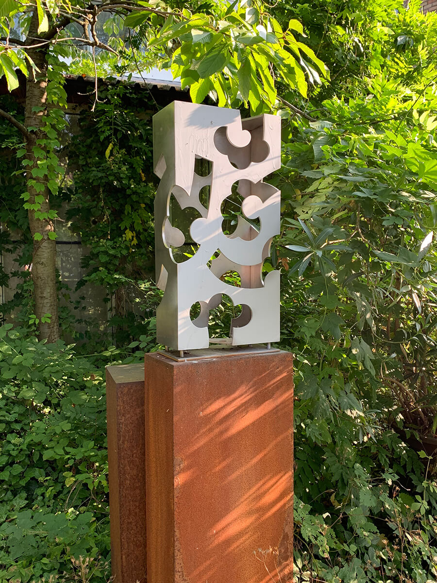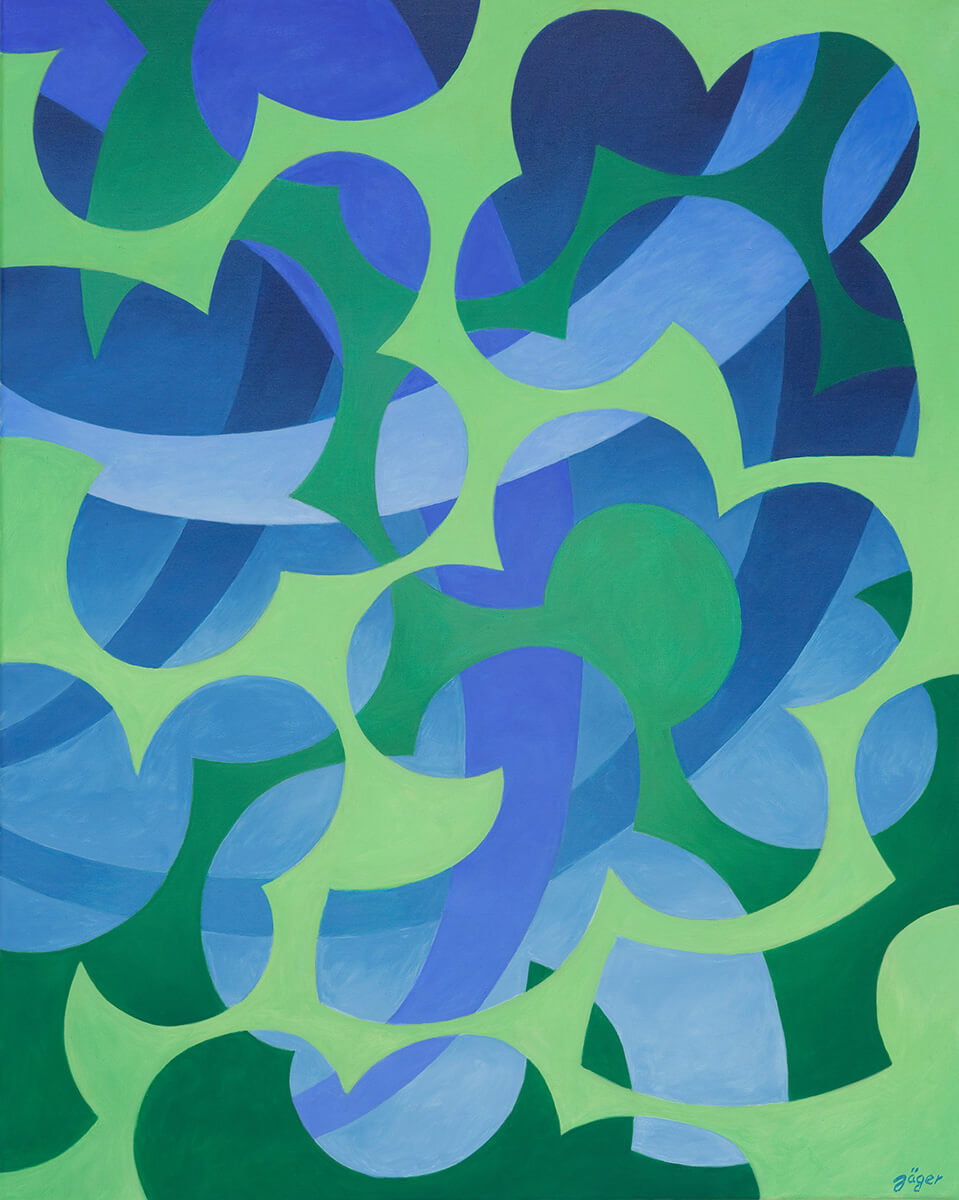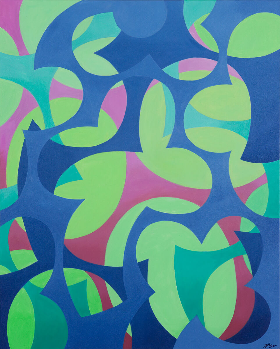Ausgehend von ihrem landschaftsmalerischen Werk überträgt Barbara Jäger seit 2005 ihre intensive Auseinandersetzung mit Natur und Landschaft in skulpturale Gestaltung. Wie in den Leinwandbildern reduziert die Künstlerin in den plastischen Arbeiten die Wahrnehmung von Natur auf zeichenhaft abstrahierte Bildformeln. Organische Formen werden einer strengen, flächenhaften Stilisierung unterworfen und auf elementare Chiffren zurückgeführt. Als Grundmodul der formalen Konzeption erscheint ein Blatt- oder Blütenmotiv, das als vegetabiles Kürzel auf die Außenseiten stereometrischer Grundkörper wie Würfel, Kuben oder Stelen übertragen wird. Analog zu den mit dynamischem Pinselgestus vorgetragenen farbintensiven Gemälden überlagern und durchdringen sich dabei mehrere räumlich gestaffelte Wahrnehmungsebenen zu einem komplexen Wechselspiel. Die aus den Kuben herausgeschnittenen Flächenformen perforieren die Außenhaut und erlauben überraschende Einblicke in das Innere. Erklärtes Ziel ist die Verdichtung und Verschmelzung von Flächenmotiv und Raumkörper, verbunden mit der Auflösung des geschlossenen Raumvolumens. Mit ihren Werken agiert Jäger im Spannungsfeld zwischen plastischer Materie und Umgebungsraum, die sich zu einer untrennbaren Einheit verbinden. Resultat ist die totale Verschränkung von Innen und Außen. „Innenräume freigeben und Perspektiven verschieben“, so formuliert Jäger ihre gestalterischen Intentionen.