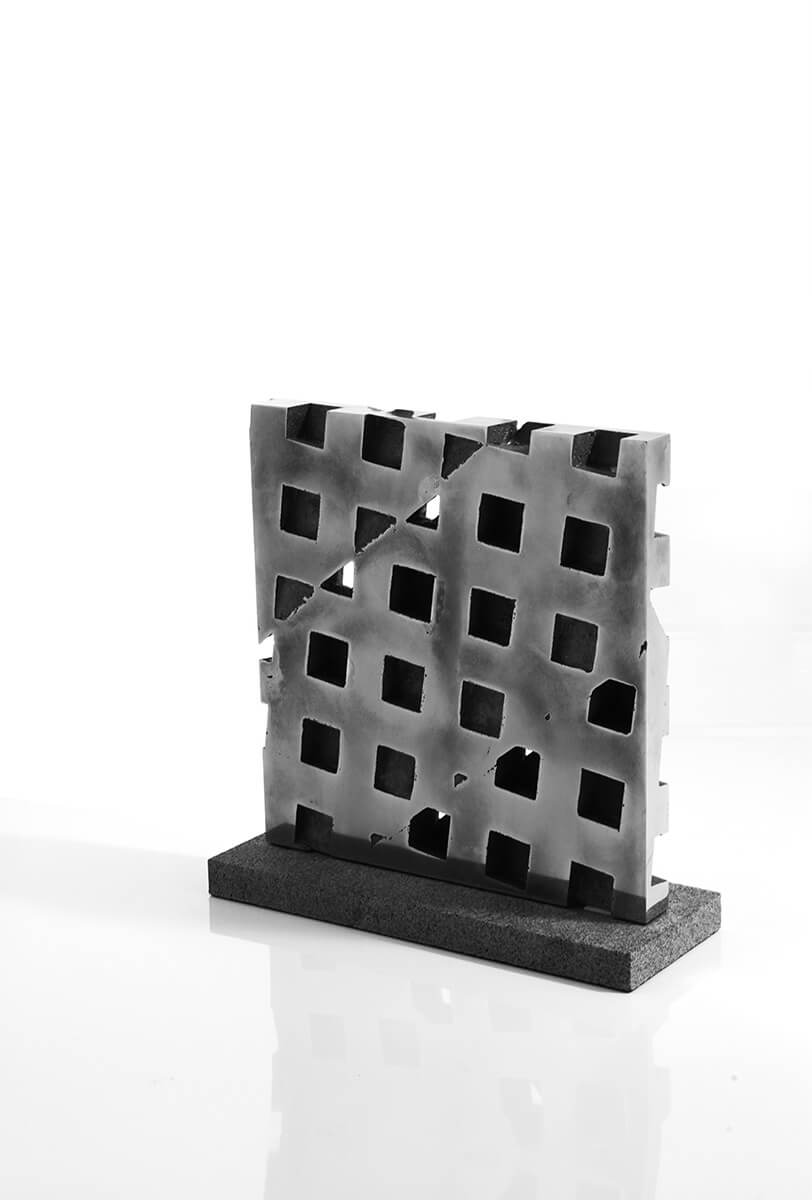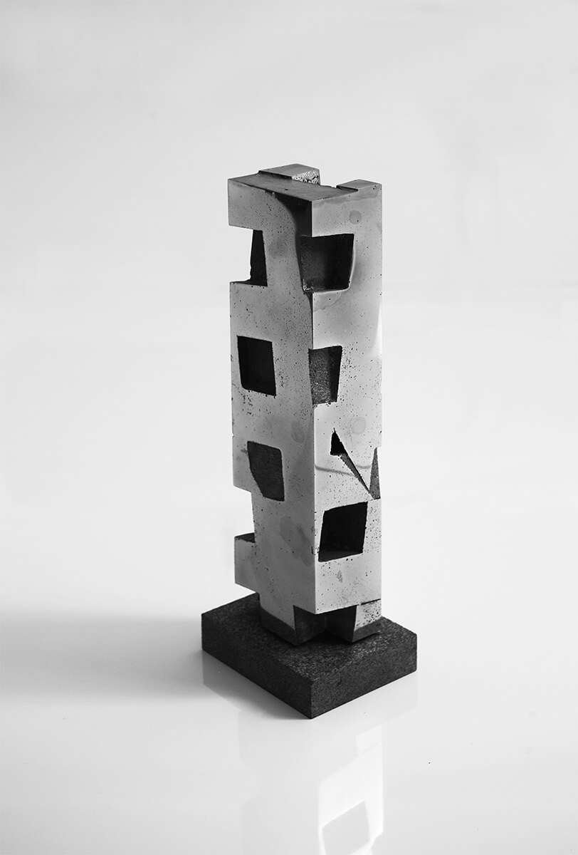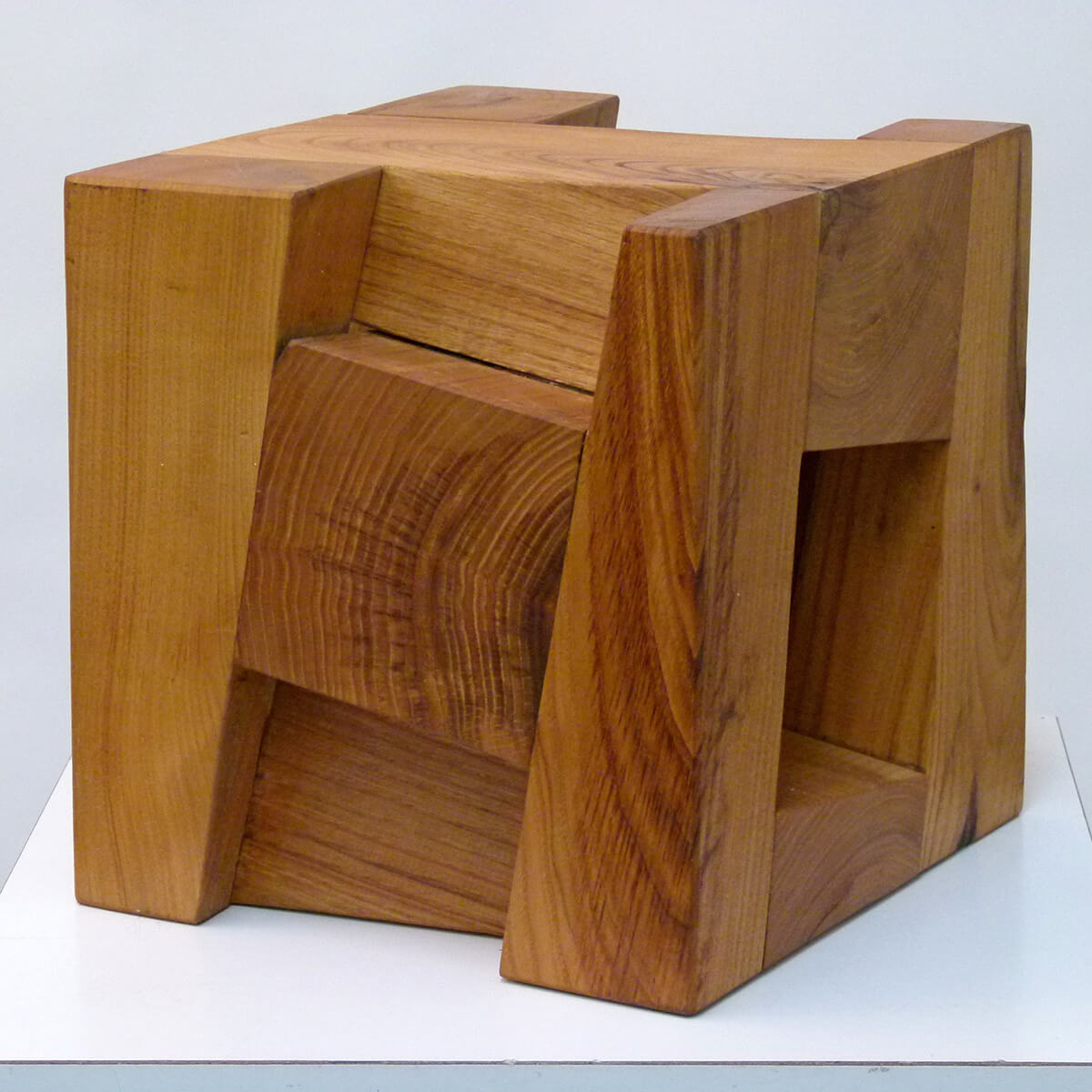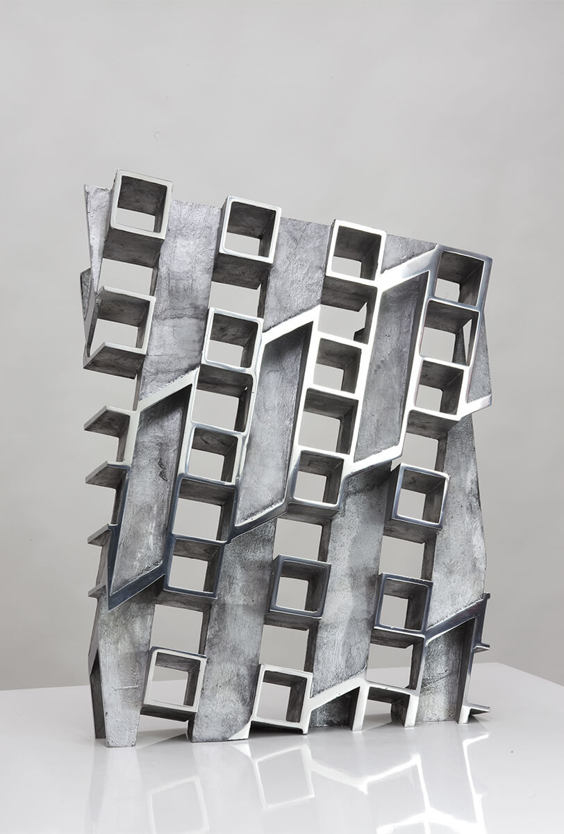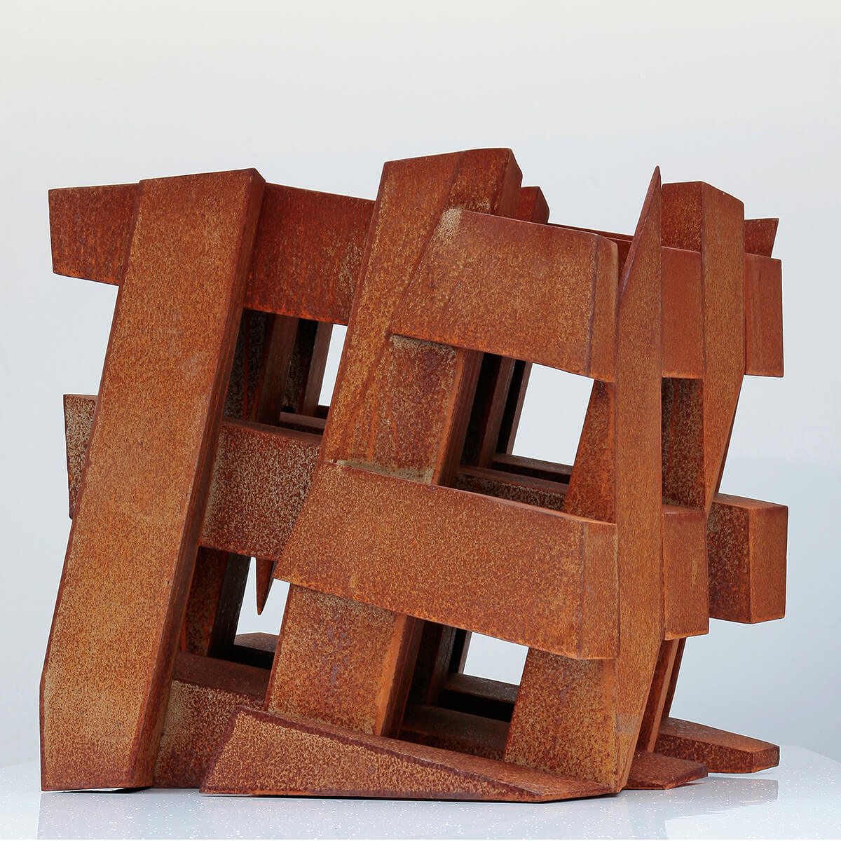 Ich beschäftige mich mit konstruktiven Plastiken. Durch Addition von Elementen mit gleichen Querschnitten und gleichen Abständen entstehen einfache geometrische Strukturen, die durch Schrägschnitte in neue Ordnungen gebracht werden.